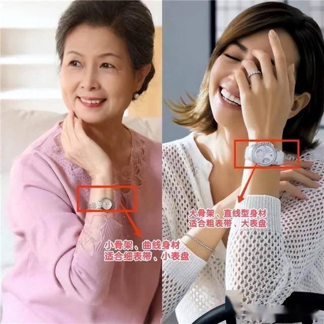 小骨架身材的中年女人可以選擇細錶帶和小錶盤的手錶,而大骨架和直線型身材的女人可以選擇粗錶帶和大錶盤的手錶,佩戴起來會更為協調。