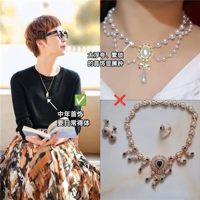 隨著年齡的增長,我們更應該注重配飾的質感和精緻度,廉價生鏽的首飾都要扔掉,去