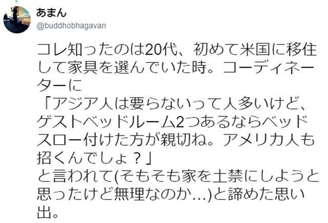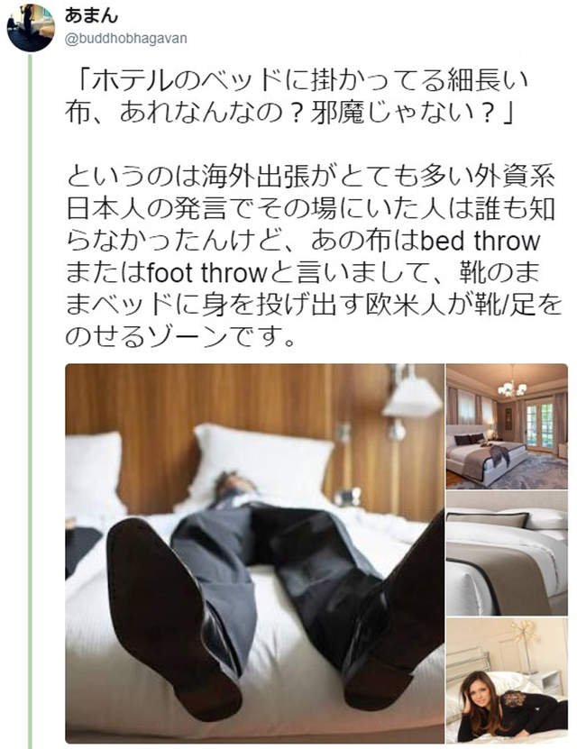 我曾經去過美國住一段時間,要挑選傢具時,設計師建議我在客房床上擺床尾巾才方便招待美國人,我就想我的家裡已經規定要拖鞋了啊,直到知道這像穿鞋睡覺文化後,我才明白這塊布其實對於其他不拖鞋的人來說很方便」,國家之間的文化差異讓網友驚喊「天阿,怎們會有人穿鞋睡覺?」。