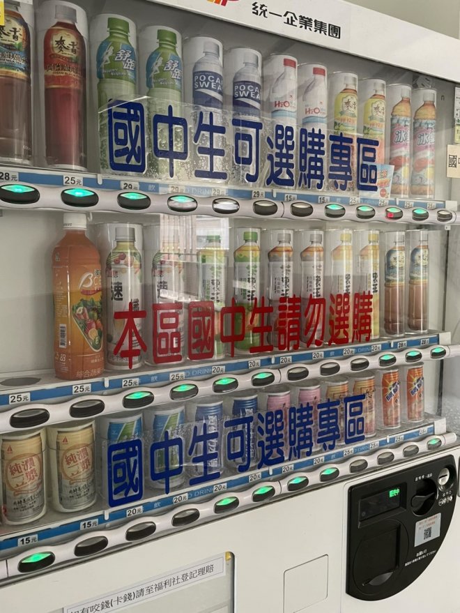 一名網友在臉書社團《路上觀察學院》上分享在路上看到的奇特一幕,只見一台看似普通的飲料販賣機,上面卻被貼了3排大字,上下兩排分別是藍色的「國中生可選購專區」,中間一排則是被紅字標註「本區國中生請勿選購」,讓他困惑直問:「買飲料也要分級制度管理?所以這台販賣機中間層是PG15 (電影分級制度:未滿十五歲之人不得觀賞) 的?」