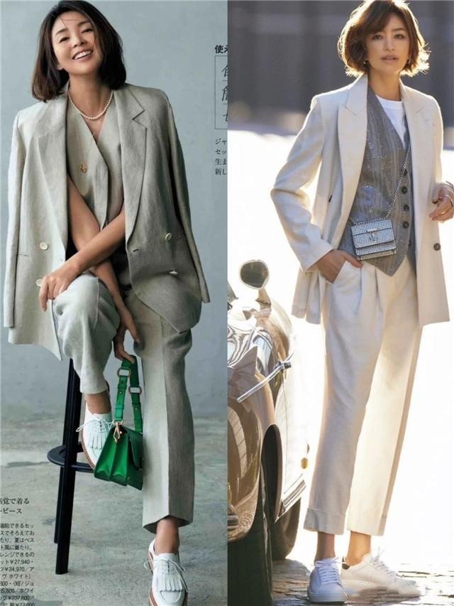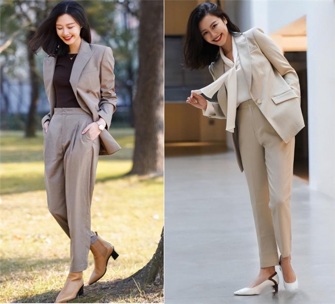 米色的溫潤如玉,再搭配其流暢的剪裁,既顯示了專業的硬朗,又不失女性特有的柔和曲線。推薦中年女性嘗試米色西裝加上同色系的「錐形褲」,這種同色系搭配法則能夠拉長身形比例,塑造出整體的高級感和知性美。無論是職業場合的需要,還是日常的精緻生活,這樣的穿搜配對總能給人留下深刻印象。
