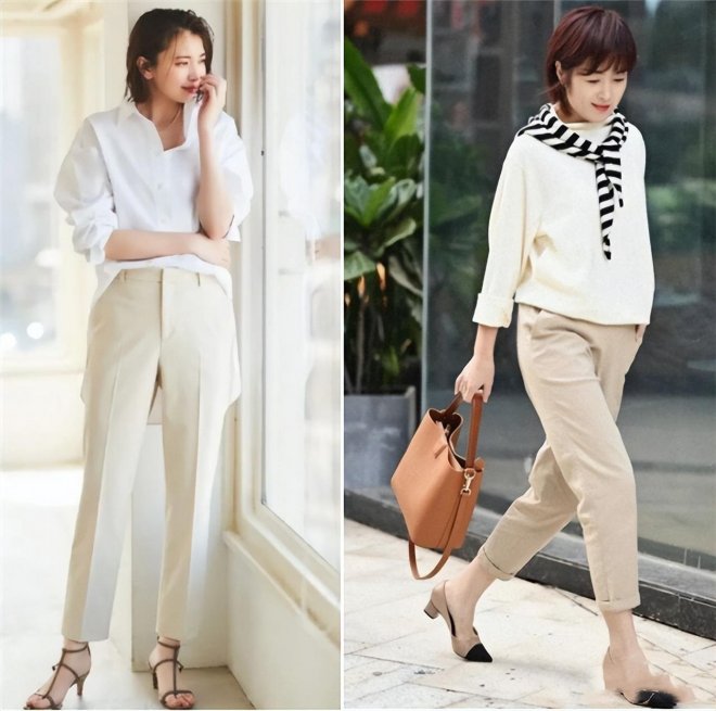 除了上衣,一條米色長褲同樣是塑造高級感的利器。與任何顏色搭配都毫無違和感,即便是市面上常見的顏色,米色長褲也能降低與他人撞衫的尷尬。它既能拉長腿部線條,又不失為焦點,賦予穿著者一種沉著的美感。
