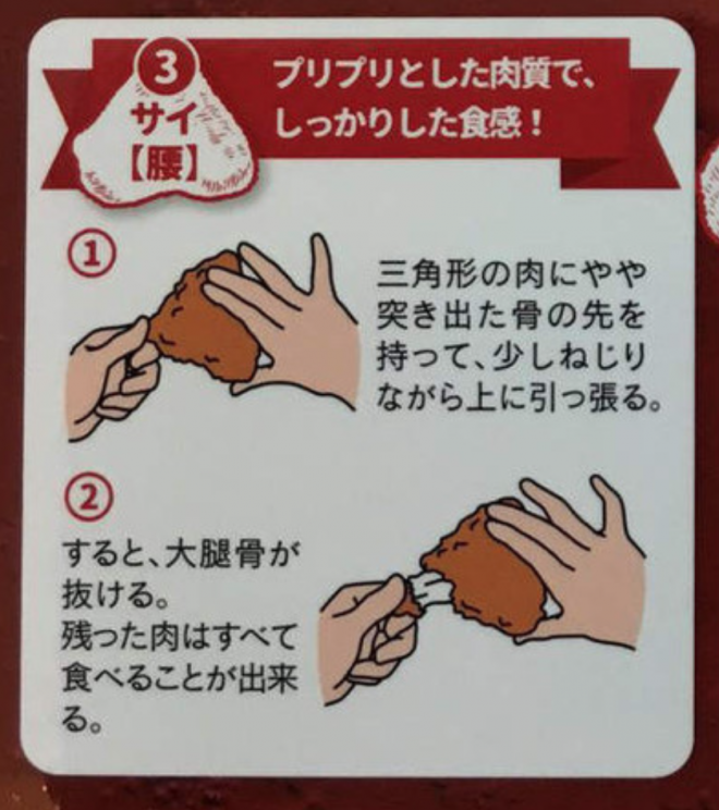 先從根部(靠近雞胸)開始吃。把翅膀往外折成一半,然後把前端骨頭抽出來,這樣就可以大口吃雞翅肉了。
