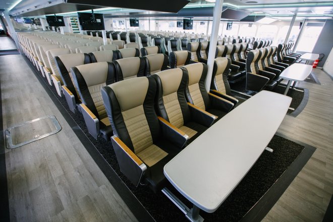 ▼以台灣國寶命名的「雲豹輪」載客數多達552人,船速最高時速70公里,而且主打不會暈船!根據百麗航運的說法,那是因為客輪配有水下平衡系統,可以把船操控得很平穩,浪打到3.5米都沒感覺!如果你是因為會暈船而有恐懼的人,請放心坐起來吧!