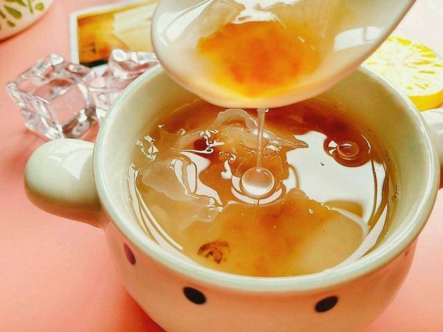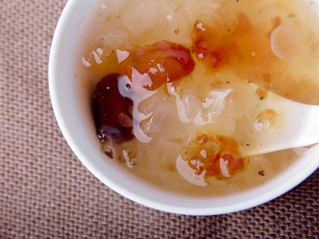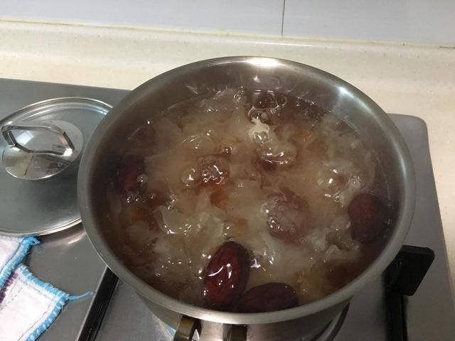 很多人都是熬好之後直接出鍋的,其實燜煮的過程非常的重要。在煮銀耳羹的時候,溫度比較高,膠質是溶在水中的,所以比較稀。燉煮完之後銀耳湯由燙變溫涼的過程,才是湯汁粘稠的關鍵。如果銀耳立即出鍋的話,突然遇冷,就會使其無法產生更多的膠質。而關火之後進行燜煮,銀耳慢慢變涼的過程中會產生很多的膠質,湯會變得非常的濃稠,口感非常的好,營養價值也能發揮到最大