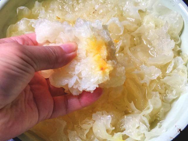 銀耳泡發之後關鍵的一步就是將銀耳撕碎了,而且是撕的越碎越好。撕的越碎,銀耳和水的接觸面積就越大,出膠就越多,湯羹也會更加的濃稠好喝。