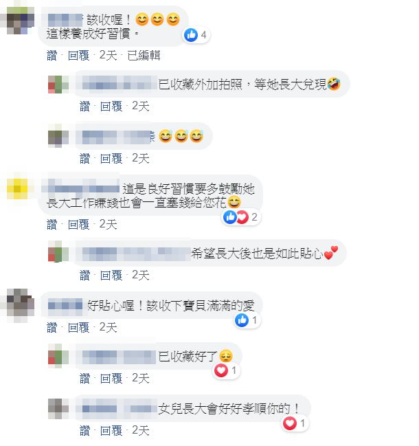 貼文曝光後,立刻就笑翻一票網友,並表示當然要把鈔票收起來,「女兒的心意要收好!但出門付錢的時候,拿錢要看清楚XD」、「好貼心喔!該收下寶貝滿滿的愛」、「要收,長大後就變真鈔票了」 、「收啊,等她長大,跟她換真鈔」、「要收,以後就會賺錢都塞給妳,還會把爸爸的錢都拿給妳,真棒」 。