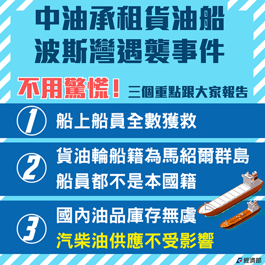 對於承租的貨油船,在伊朗外海疑似受到襲擊,船上的7.5噸石油腦,疑似全數報銷,中油石化事業部執行長吳義芳出面證實,他們租用的油輪原本預計在7月抵達台灣,孰料竟然發生這樣的事情,船上價值10億元的石油腦,已經全部付之一炬。