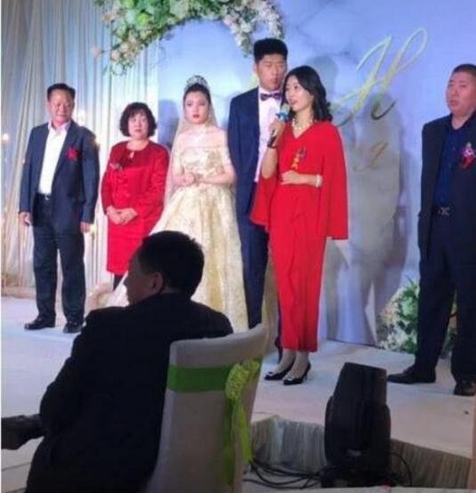 當時這位婆婆在台上講話,而台下所有人的目光都聚集到她身上。新娘子就站在一旁,跟自己的婆婆相比,她的風頭完全就被搶光了。看起來,婆婆的顏值也是不輸給自己的兒媳婦。