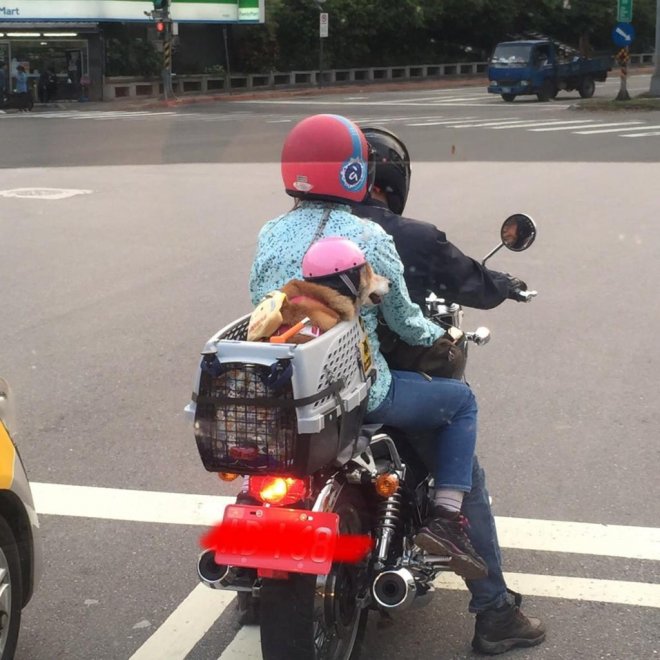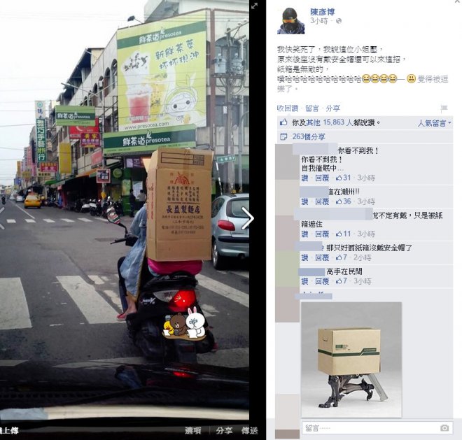 另外之前也有民眾在路上拍到一台雙載機車,不過後面的人在身上套了個大紙箱,就為了掩飾自己沒戴安全帽的事實!前面的人還特地反穿雨衣想遮住後座露出來的腳,不過其實從旁邊看起來超明顯的啊XD