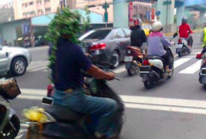 其實之前也有網友分享在路上看到的爆笑畫面,原來一名男子忘了戴安全帽,不過為了逃過警察的眼睛,竟然急中生智的「自製」了一頂安全帽!是的~你沒有看錯,他隨手抓起路邊的樹枝,直接在自己的臉上圍成一圈,看起來就像是一隻綠油油的獅子一樣XD