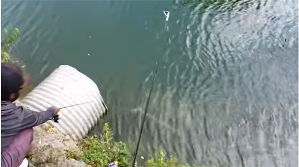 他們垂釣很順利,魚竿落下沒多久就釣上了一條體型豐滿的「金魚」,瞪著圓圓的眼睛,嘴巴裡掛著魚鉤一張一合。
