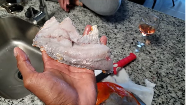 他用長刀切下一塊魚肉,去掉魚鱗的魚肉是灰色的,跟普通的魚肉看起來一樣。