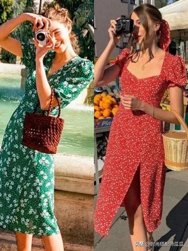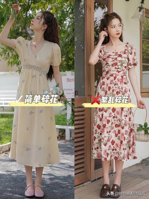 法式裙的款式特色,一定是與碎花息息相關的,如何把碎花穿出高級感?我們的建議是越簡單越好。比如偏素色的面料作為底面,碎花的點綴就要精簡,視覺上也要展現出一些空隙,繁亂的款型真的很容易暴露出你身形的寬度,一不小心就顯胖顯臃腫。