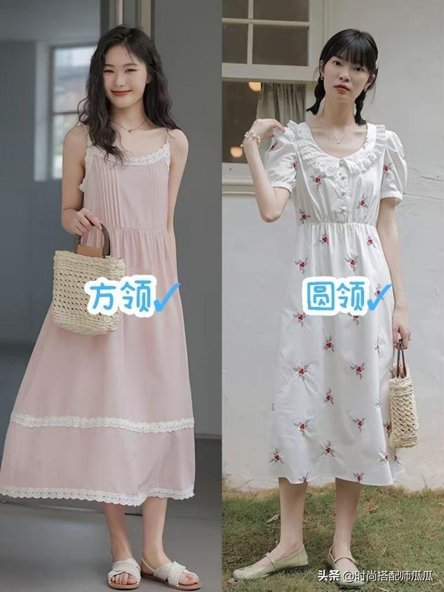 在細節的款式設計上,領口部位的款型是法式裙的焦點所在,比如大圓領和大V領,可以展現出更多的肩頸線條,可以優化頭身比例,在駕馭長裙款式的時候,我們才能更加便捷的調節視覺放置的位置,方便小個子或者大骨架的女生優化恰到好處的頭身對比線條,身材不會顯得壯。