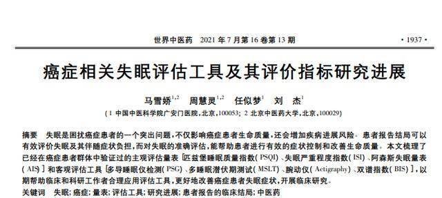 [1] 馬雪嬌.癌症相關失眠評估工具及其評價指標研究進展, 世界中醫藥 ,2021-04-27.