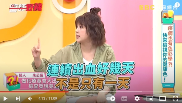 朱芯儀日前上節目《醫師好辣》,回顧當時的治療情景。她表示,在做完首次化療後,下體突然無緣無故出血,且血量極多。起初,她以為是自己身體還沒適應療程,因此沒有太放在心上。但三週後她進行第2次化療,卻又迎來大量出血,讓她開始有些緊張,「我嚇瘋了,因為化療是會讓月經完全暫停的,所以不應該會大出血」。