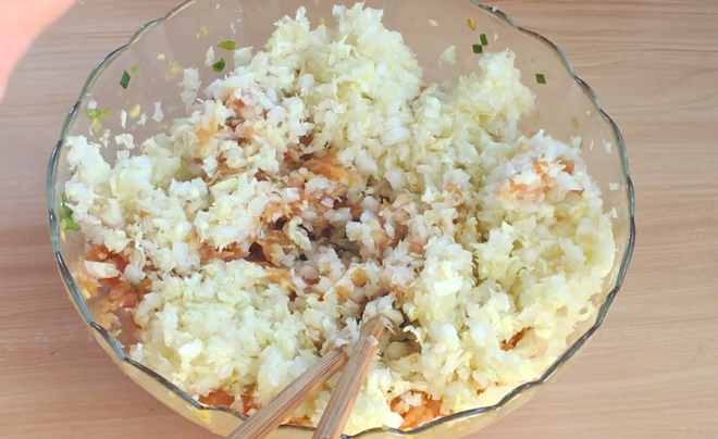 3白菜一顆給它切成長薄片最後切成小丁,然後在裡面加入三克精鹽,用手抓拌均勻。500克的麵粉往裡面加入200毫升的溫水,先用筷子攪拌成絮狀再用手揉成光滑的麵糰。揉好之後放入碗中。