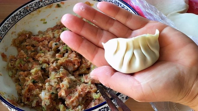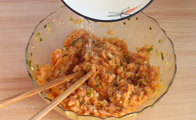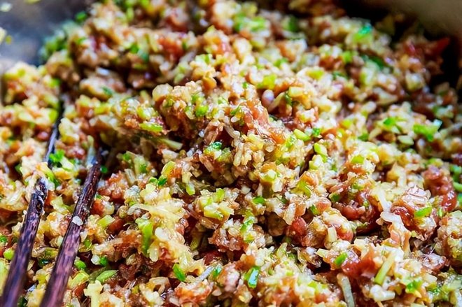 1.首先準備豬肉500克給它切成厚片最後切成小丁然後剁碎放入碗中,往豬肉餡裡面加入三次蔥姜水。讓豬肉餡充分地攪拌均勻上勁,這樣煮出來的餃子肉餡抱團還好吃。