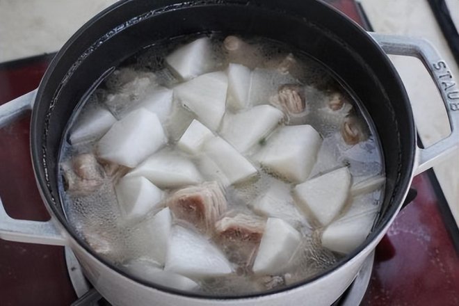 4.水燒開後轉中火給它煮沸35分鐘,35分鐘後把準備好的白蘿蔔加進來。蓋上蓋子用小火繼續煮沸十分鐘。然後在裡面加入精鹽,胡椒粉在上面撒上一小把蔥花就可以出鍋啦。