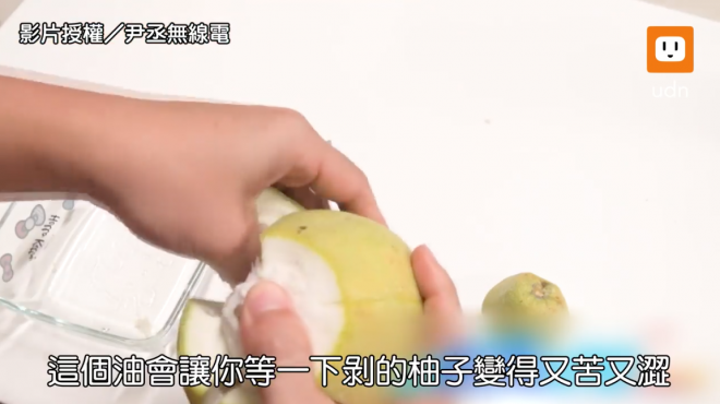 不過,這種方法雖然能完整地取出果肉,卻有點費勁,雙手也會因為剝完皮後,沾滿柚子的油,這就是造成苦味的最大元兇!