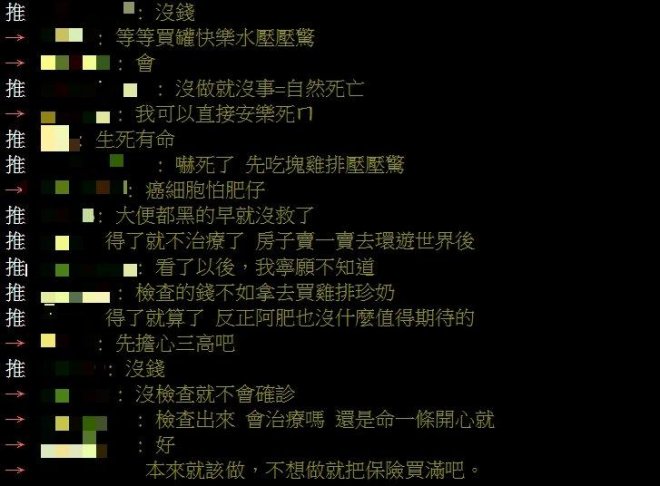 其他網友打哈哈說:「先買罐快樂水壓壓驚。」、「已經打算去吃雞排了。」、「得了就不治療了。」、「先擔心三高吧...」但有些網友則認為:「本來就該做,不想做就把保險買滿!」、「我5年做一次大健檢,抽血檢查那種,每年都有做,當追蹤體況。」、「早期發現小錢可醫,晚期發現就沒救了。」、「腫瘤越早期發現越容易治療。」