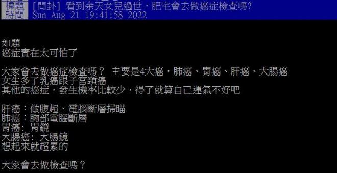 做健檢的目的,就是趁著疾病潛伏人體,症狀並未顯現時,早期發現、早期治療!近日余天女兒余苑綺離世,讓大家開始注重直腸癌的初發症狀,原因在於余苑綺注重健康、不菸不酒,還是擋不住癌細胞來勢洶洶,對此,有網友在「批踢踢論壇」有感而發:「看到余天女兒過世,你會去做癌症檢查嗎?」