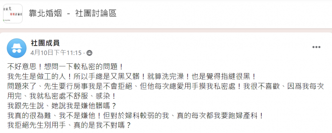 原PO在臉書社團「靠北婚姻-社團討論區」中發文表示,先生職業是做工的人,因此手總是黑黑髒髒的,就算洗過澡手指縫也依然很黑、好像還卡著油汙或泥土沒洗乾淨一樣;不過原PO其實也並沒有因此嫌棄老公或拒絕與對方行房,只是兩人恩愛久了,她就發現老公特別喜愛用手指摸她私密處,而每次老公碰完後她就會發炎、感染,讓她常常得跑婦科治療而感到不適及困擾。