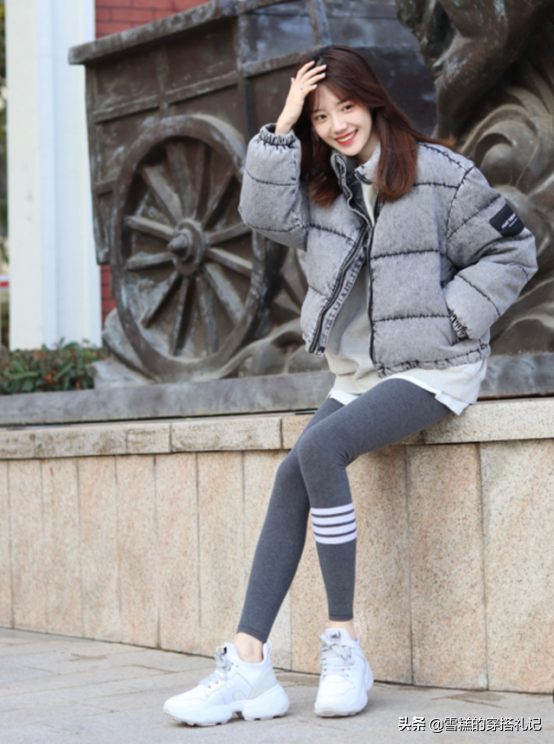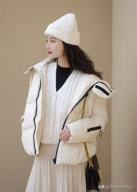 白色羽絨服+百褶裙:白色系羽絨服帶有少女的純潔,簡約而又甜美,非常減齡。搭配輕盈靈動的百褶裙,給造型增加了優雅的韻味。