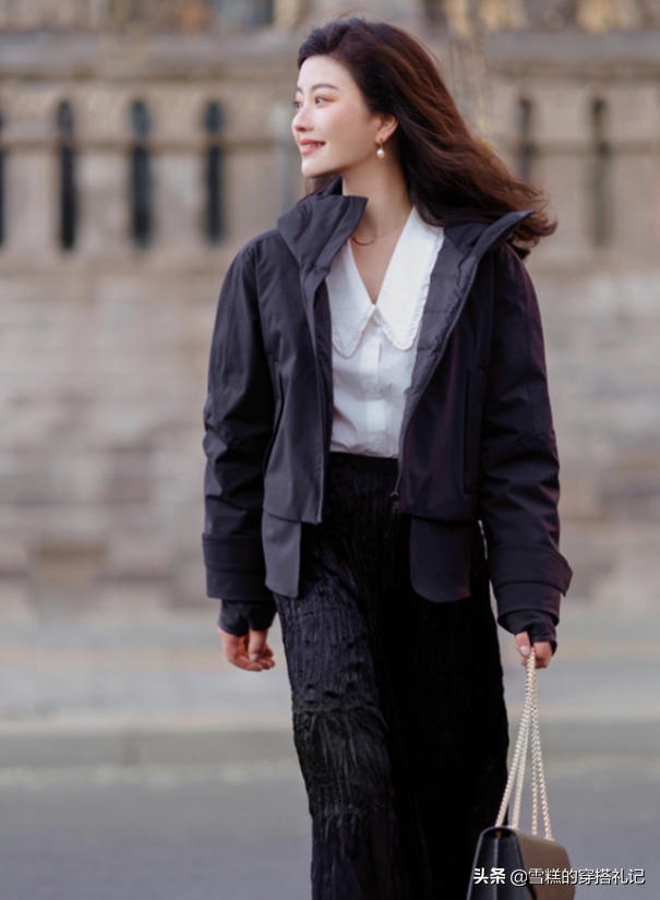 黑色羽絨服+包臀裙:黑色羽絨服成熟穩重,而且風格百搭。搭配包臀裙,性感而又迷人。精緻的首飾會讓整體造型更加精緻。內搭方面建議選擇淺色系,深淺區分顯得整體穿搭更有層次感,非常適合通勤或者外出聚會~