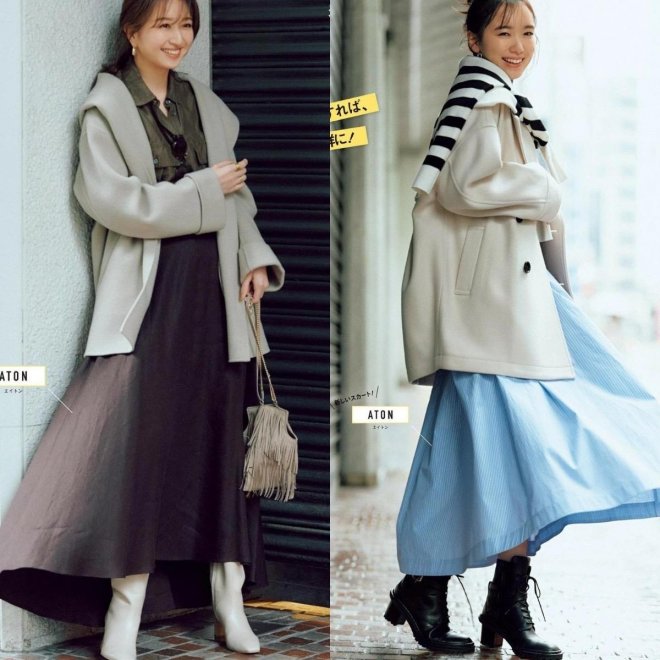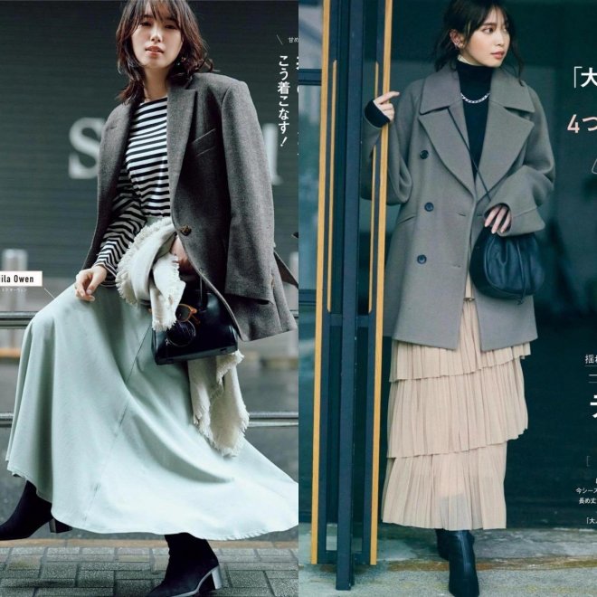 中性風十足的毛呢大衣,建議大家可以選擇剛好遮臀的款式,長度太拖沓反而會容易顯矮。廓形設計的遮臀大衣,直接搭配一件闊擺傘裙,踩上一雙粗跟踝靴,給人的感覺就會非常時尚有品位。