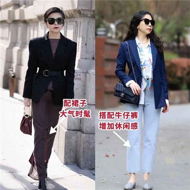 在具體挑選外套的時候,其實大齡女人有很多種選項,我們完全可以根據自己需求,去判斷穿衣的方向。對於很多職場女性來說,西裝便是不二之選,配裙子大氣時髦,搭配牛仔褲增添休閑感;無論是收腰西裝還是直筒西裝,都很值得大家去嘗試。
