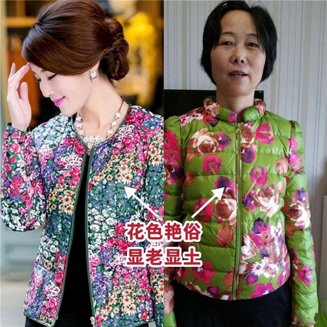 好多大齡女人特別喜歡穿花衣服,就連在挑選外套的時候,也離不開各種印花圖案。花衣服的確非常吸引人,但是這種花色特別艷俗外套,穿在身上就會顯老顯土;外套作為主導單品,不適合加入太繁瑣的印花,反而越簡單越容易穿出高級感。