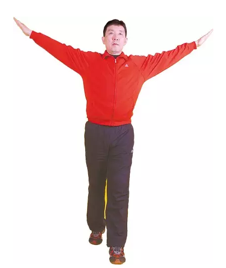 兩隻手側平舉,然後向上高抬45度,兩隻胳膊看做鐘錶上的時針和分針,打開到鐘錶十點十分的位置上,這個動作就是十點十分了。我們的要求就是手心朝下,胳臂舉在身體兩側略靠後一點,手指頭繃起來,頭抬起來。就這個方法,每天堅持走200步。