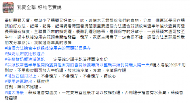 原PO在臉書社團「我愛全聯-好物老實説」上分享,一般的蒜頭在常溫下約可保存六個月,過了中秋後,未使用完的蒜頭就可能開始發霉或發芽。不過,她從一位朋友那裡學到蒜農教的一招可以延長保存蒜頭的方法,她自己也依循此方法兩年了,一直感到非常實用。首先是準備好洗淨且晾乾的家庭號鮮奶罐或優酪乳空罐~