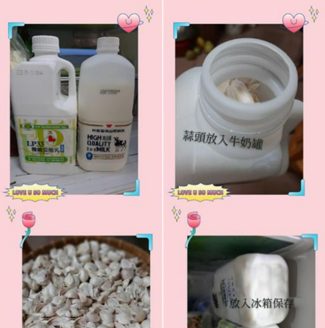 等蒜頭完全冷卻後,接下來的步驟是將它置於乾淨的家庭號鮮奶罐或優酪乳罐中,然後放入冰箱冷藏保存。原po也提醒說,在準備鮮奶罐時,務必確保罐子要乾淨並且乾燥沒有水份,而上述的保存方式適用於已經放了半年、即將變質的蒜頭,如此就可以再放個四個月以上也不會發芽,「要用時再取出,蒜皮很好剝,辣味不減喔~」。
