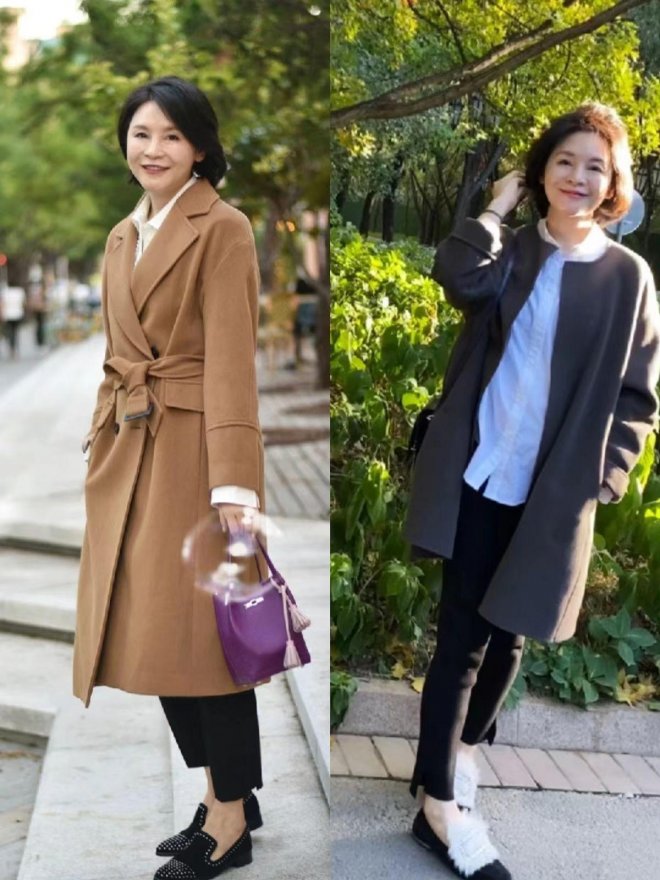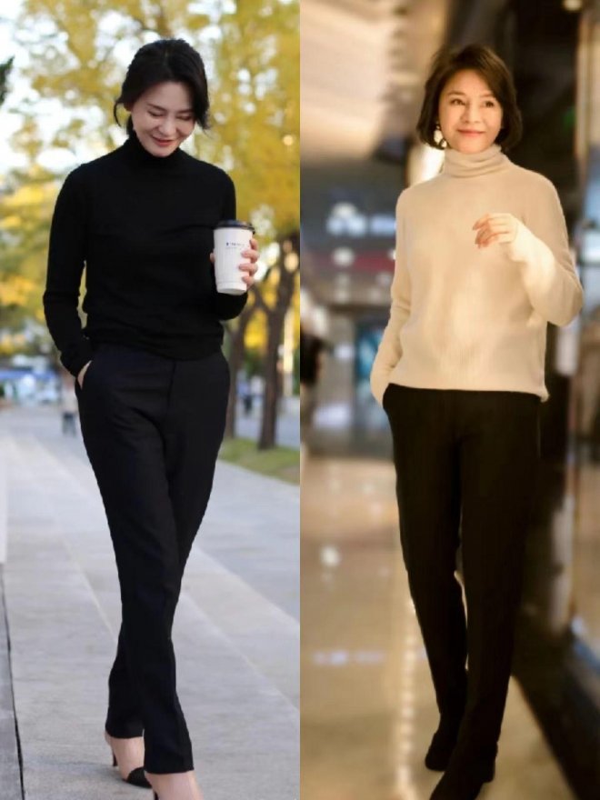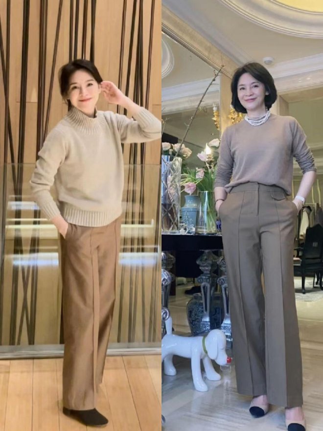 另外,用西裝長褲凹造型,中年媽媽們最好匹配尖頭奶奶鞋或者黑色短靴,進一步延伸腿型長度。