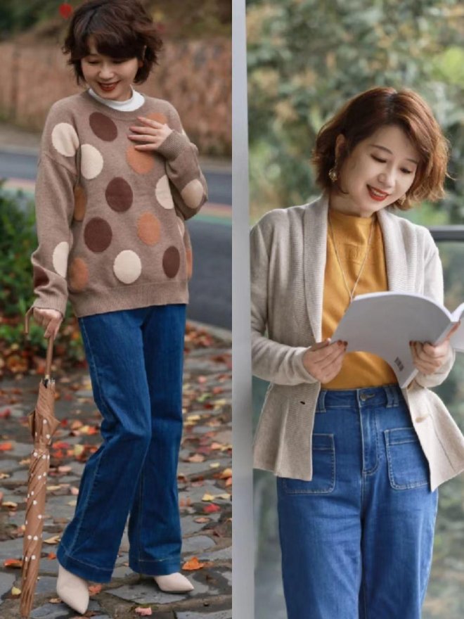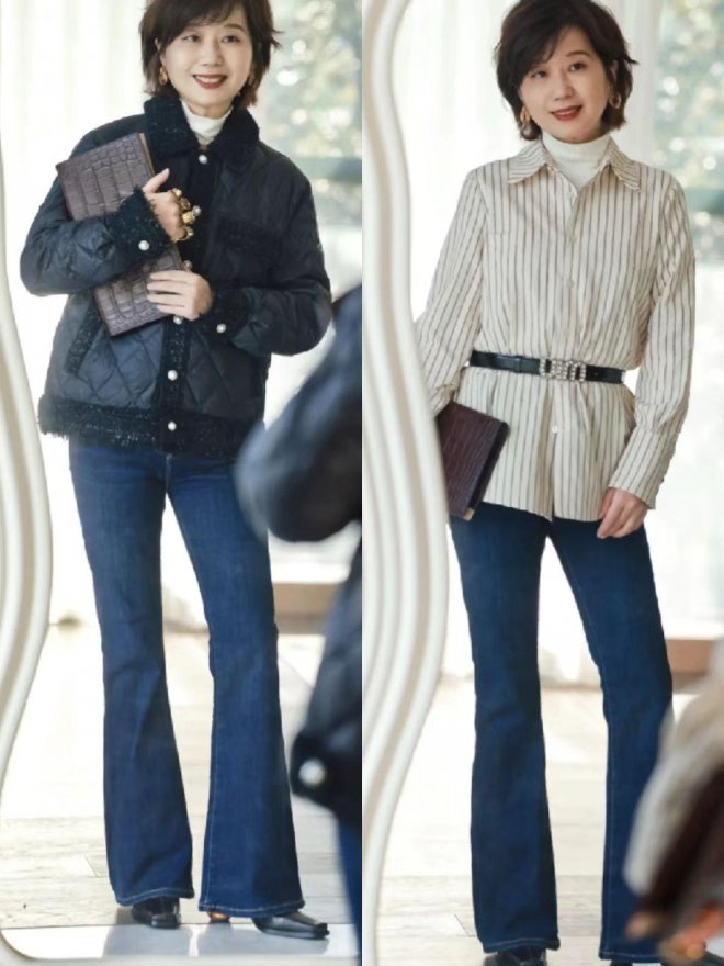 黑色短棉服或者一些開春短夾克,又或者襯衫,穿搭這些單品時除了藉助腰帶改善比例,中年媽媽們也可以像博主女巫和她的綿羊米婭一樣,通過匹配微喇長褲牛仔褲塑造大長腿。