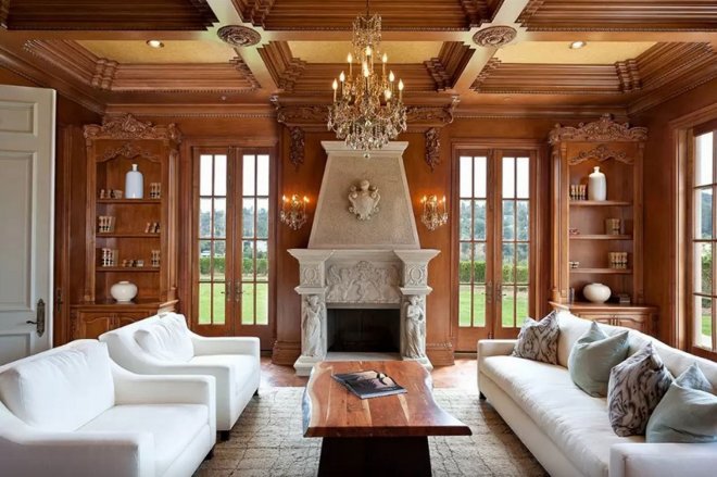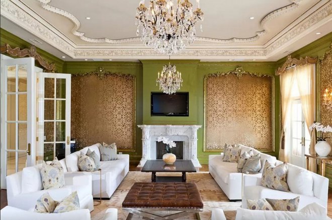 繼續往裡面走,看到一個家的主體「客廳」是以皇家式的風格下去打造,金碧輝煌的水晶燈與壁框,加上純白色的家具選擇,整體視覺相當清新宜人。