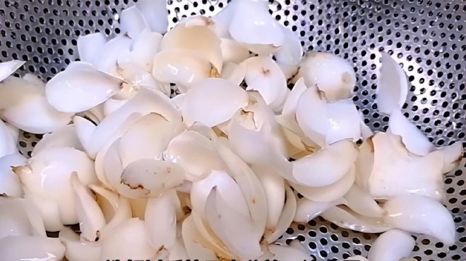 3.浸泡好的柚子瓤,用水沖洗乾淨,鍋里放入開水,柚子瓤放進去,焯水三分鐘。撈起來放入盆里再沖洗幾次,擠乾水分。
