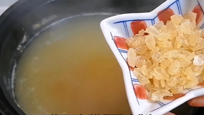 3.將過濾好的梨汁置於火上,大火燒開,燒開以後用濾網把浮沫撇掉。往裡面加入些冰糖,冰糖和梨汁的比例大概是1 : 5。