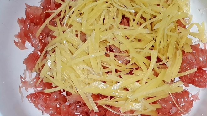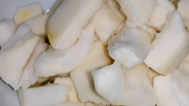 1.把柚子肉取出來。這些白色的饢不要扔掉,可以用來做柚子糖,把柚子肉取出來,這個白色的瓤改刀切成小塊,放入碗里,加入食用鹽,加入清水浸泡半分鐘,撈出來,用流動清水沖洗乾淨,放入鍋里焯水三分鐘。這個焯水的步驟主要是去除柚子皮的苦澀味。
