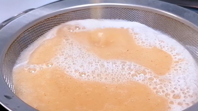2.將雪梨打濕,往上面撒些食鹽。搓洗乾淨,洗好後的雪梨切開,去掉梨核,再切成小塊,直接倒入破壁機或料理機,加入等量的清水,按果汁鍵打成梨汁,打好以後,準備一個濾網,將梨汁用濾網過濾到砂鍋中。濾網中的梨渣,用勺子翻動擠壓幾下,盡量把梨汁都擠壓出來。