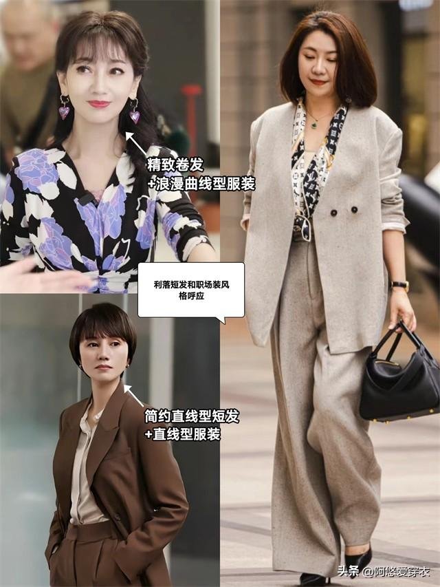 比如趙雅芝的捲髮和花朵雪紡裙都屬於曲線型,就富有女人味;袁泉的短髮和西裝都偏直線,就幹練;利落型短髮+穩重西裝,皆選中性風,氣質也會更颯~