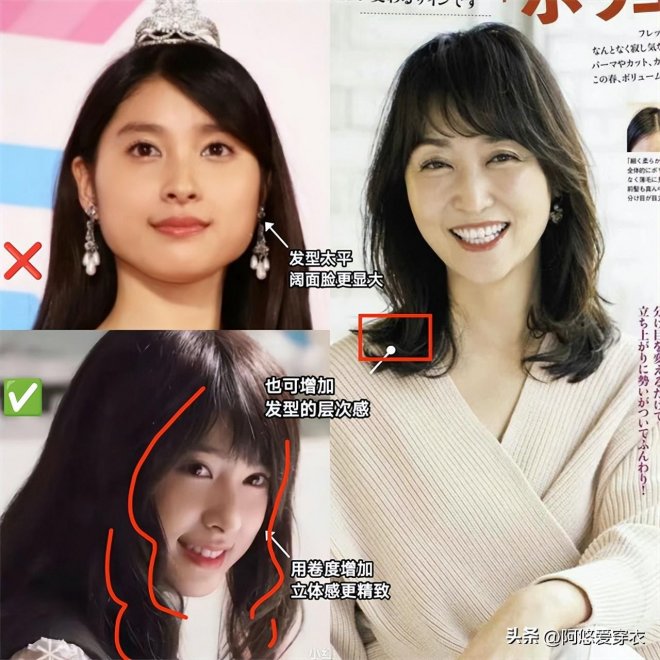 這樣的臉型顯臉小全靠「遮」。可利用拉長臉型的斜劉海、側分劉海「遮」;也可用側分發、披髮「遮」;扎髮就增高顱頂,加上側邊劉海「遮」。