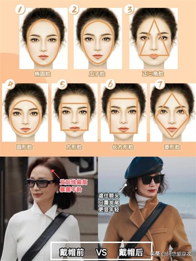 圓臉的劉海要靈動,更適合龍鬚劉海和八字劉海。長臉選法式劉海和三七分劉海修飾。偏分劉海和公主切劉海都很適合方臉與菱形臉。至於帽子,大齡女性看準寬檐禮帽、貝雷帽、漁夫帽選即可。