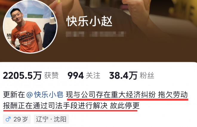 由於快樂小趙2020年因搭乘公車時斥責吵鬧乘客,正義之聲爆紅,也為他吸引許多年輕粉絲,後來與公司傳出重大經濟糾紛,遭拖欠勞務報酬,不得不轉移到新帳號「快樂小皂」更新,粉絲剩下2萬多,身體不健康外加事業上承受的壓力,難以想像他樂觀堅強的外表下,忍受著怎樣的委屈與孤獨。