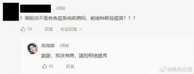 不僅回應粉絲,周海媚過去上節目訪談時就曾透露,自己從10幾歲時就出現「血小板低下」的問題,最嚴重還曾昏倒送醫,也常常滿身都是瘀青,還被醫生誤以為是被家人虐待,長大後又復發一次,認為這就是血小板偏低的老毛病,仍被醫生建議要暫停工作好好休養,至今仍查不出是什麼原因導致,但對罹病她看得很開,笑著表示:「生病是件很正常的事情,沒有澄清的必要。」除了紅斑性狼瘡外,學生時期還因為常常走到一半暈倒,被同學謠傳是血癌!