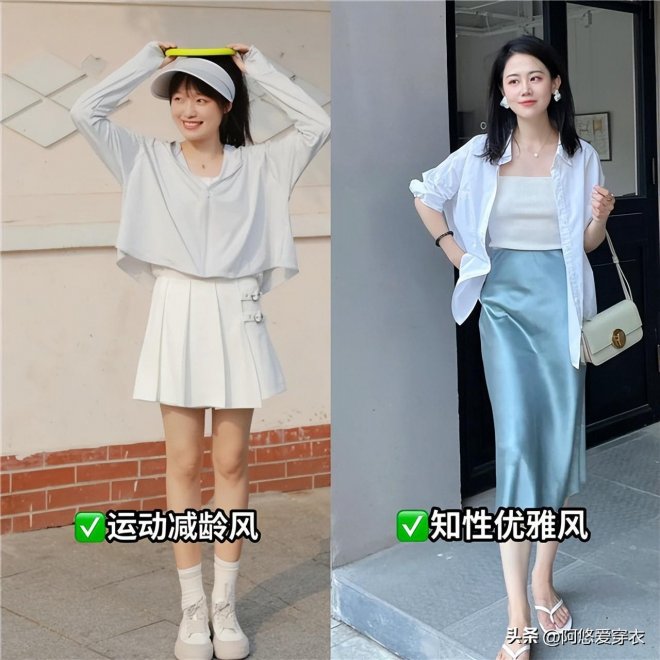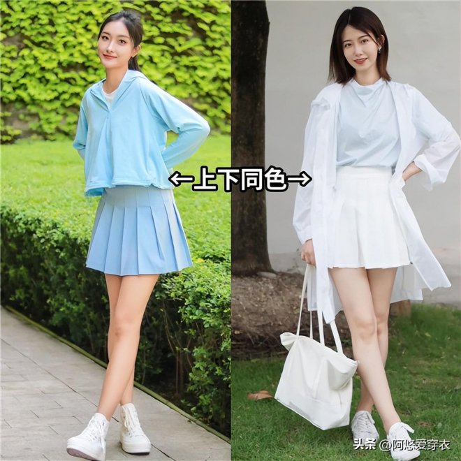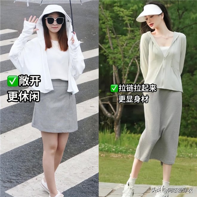 <①>配色講究清爽,防曬衫和半身裙的顏色選擇也建議多選淺色,這樣穿在身上會顯得更加清新脫俗,降低整體造型的沉悶感。