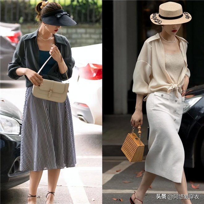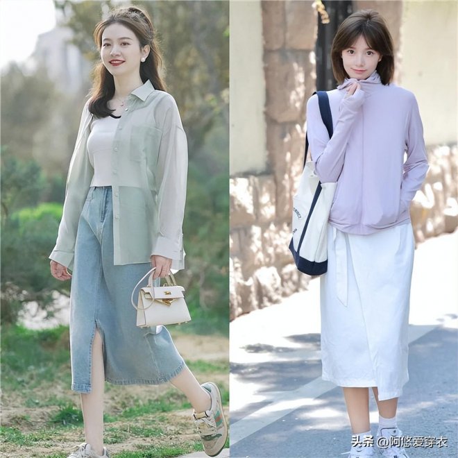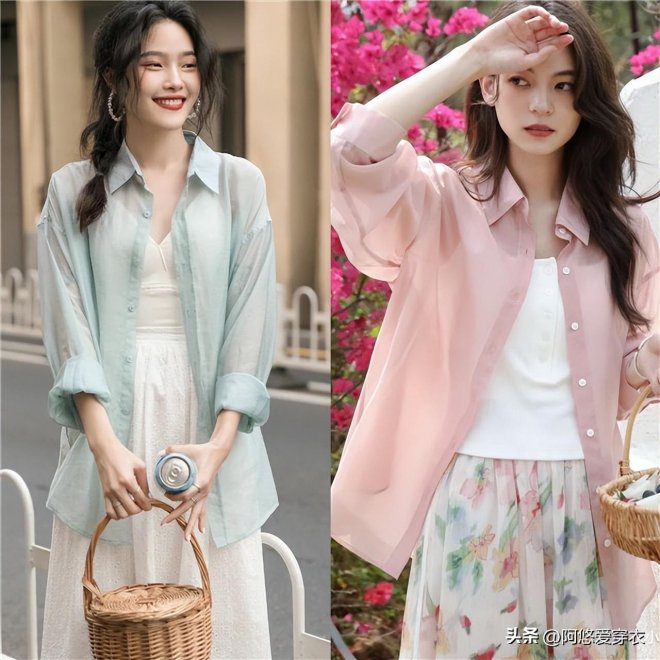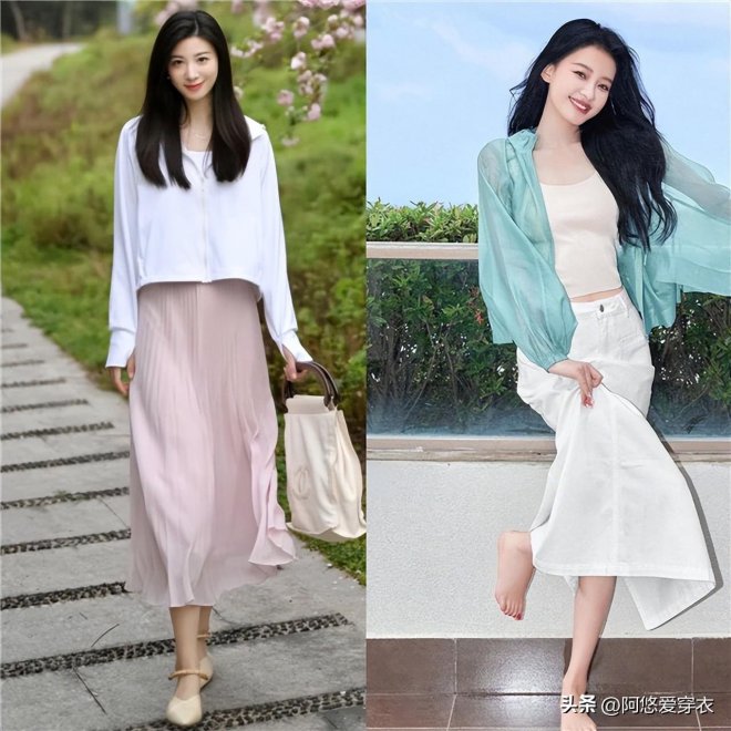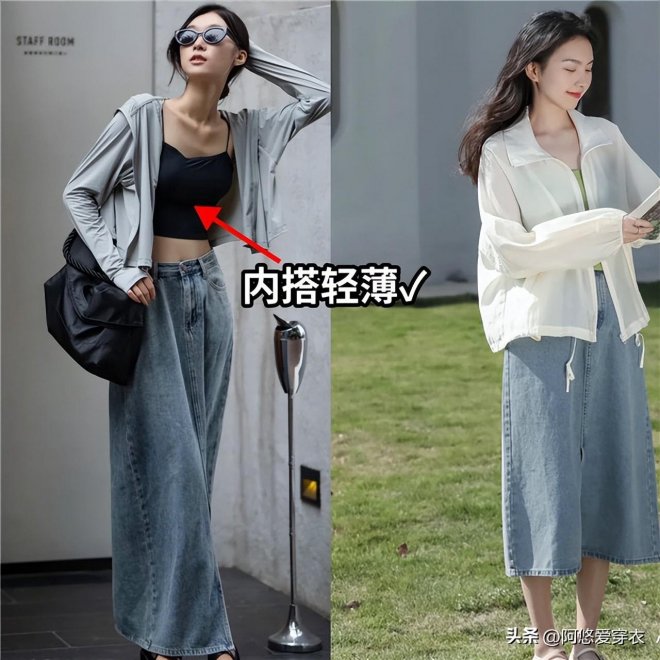 穿防曬衫還有搭配半身裙的時候要注意麵料質感,防曬衫雖然輕薄,但是也不能選擇料子太皺的款式,容易顯得廉價,選半身裙的時候也要選擇垂感向下的面料,比如說緞面或者是這種雪紡的材質,具有一定的量感,又不會太厚重,穿起來會向下拉伸腿長。